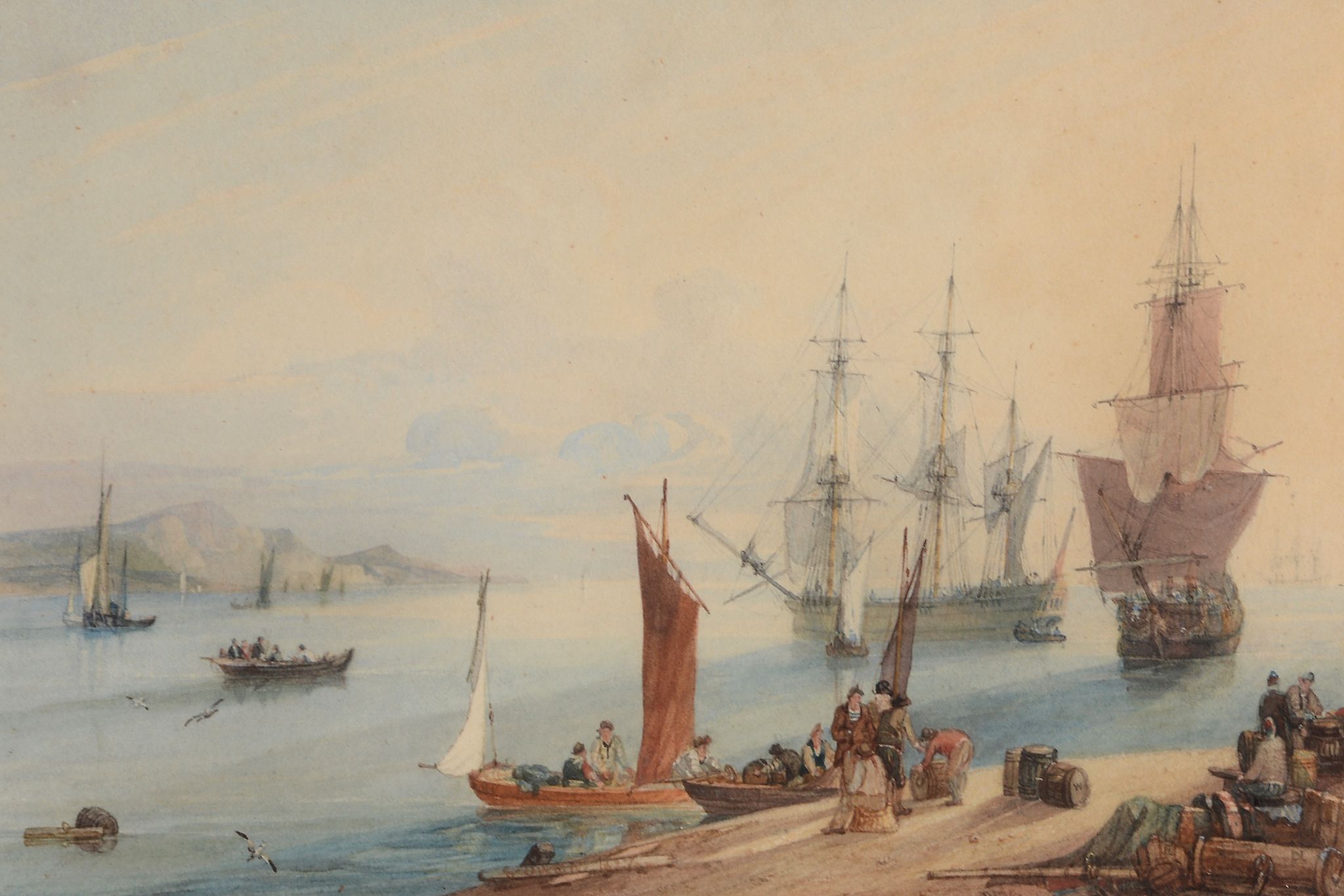 | Fisherman in a harbour at sunset, unloading barrels | |