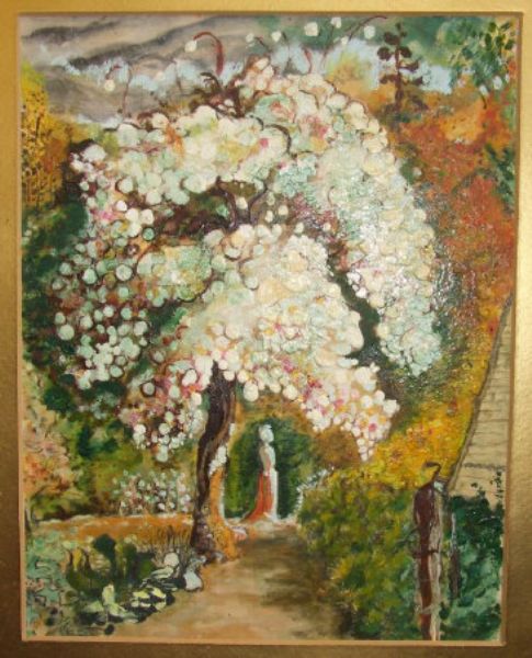 a garden scene with a figure standing beneath a tree