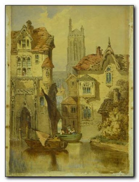 | Flemish canal scene with figures on small boats amongst houses, with Cathedral | |