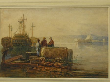 HULKS IN AN ESTUARY, FIGURES CONVERSING IN THE FOREGROUND
