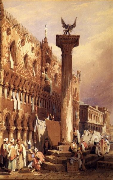 | View of the Doge's Palace, Venice, with numerous figures seated and standing around column on waterfront | |