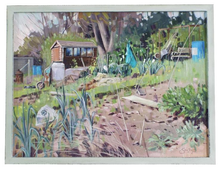 Allotment scene with a garden shed, wheelbarrow and water butt nearby