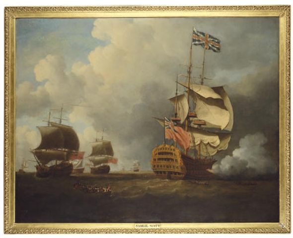 | The Royal William (formerly the Prince) firing a salute as she shortens sail when arriving at the fleet anchorage | |
