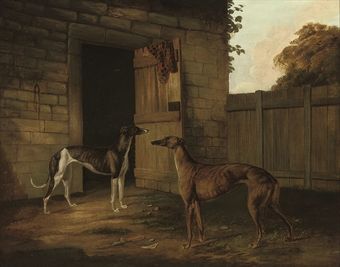 Two greyhounds outside a stable
