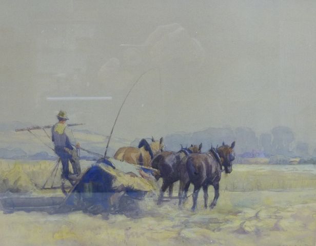 Ploughing, a farmhand on an early harvester pulled by three horses