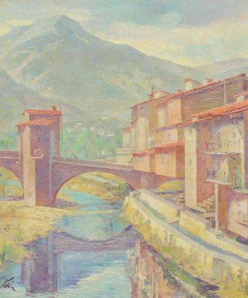 European City on the River with Mountains in the Distance