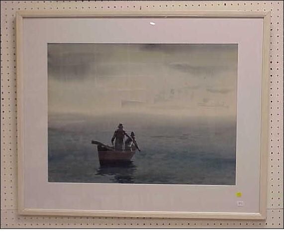 | two fishermen in a dory with a large outline of a ship in the distance visible through the fog | |