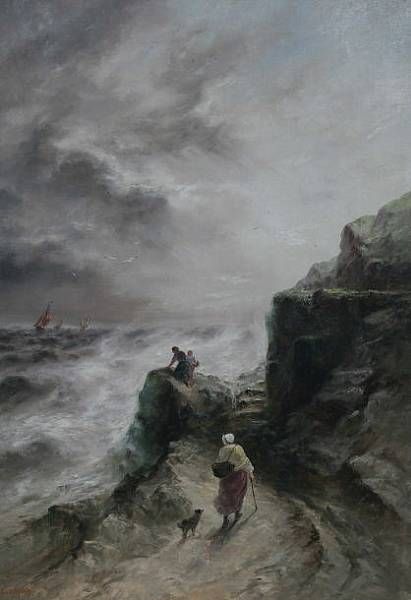 | A stormy coastal scene, figures on a coastal path looking out to sea towards fishing boats | |