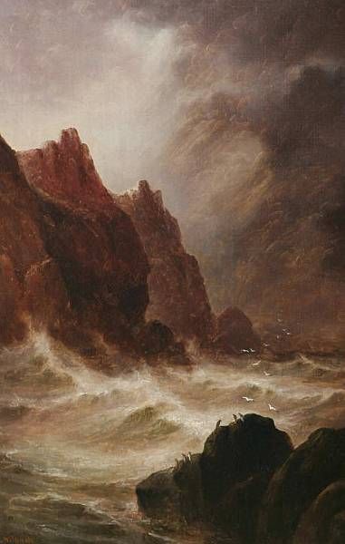 A stormy coastal scene with birds to the fore on rocks, cliffs beyond