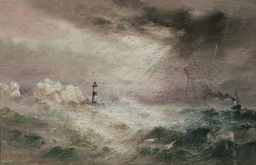a stormy seascape, a lighthouse beside rocks, a steamship nearby