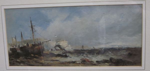Fishing boat and figures on a beach