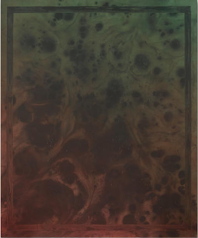 Untitled Painting in Red Over Green w/ Painted Faux Wood Grain Frame
