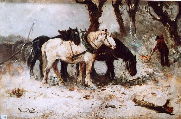 Waldarbeiter und rastende Pferde in Winterlandschaft