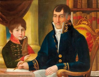 Portrait d'homme attablé, et de son fils en habit de hussard