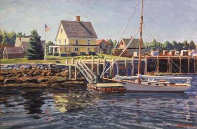 "Carvers Harbor", oil on canvas, signed lower right, titled verso, depicting a yellow house with moored yacht, Pine Tree Shop & Bay View Gallery of Camden label, in a maple box frame, OS: 49 1/2" x 73 1/2", SS: 47 3/4" x 71 3/4". Fine condition. From | |