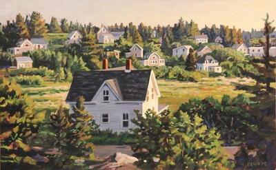 "Meadowside, Monhegan", oil on canvas, signed lower right, depicting a cluster of small homes, in a gold molded frame with linen liner, OS: 43" x 63", SS: 33 1/2" x 53 1/2". Fine condition. From the former MBNA Corporate Collection. | |
