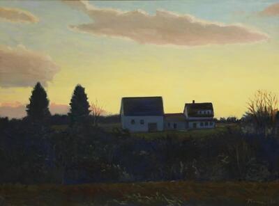 "Silhouette", monumental oil on canvas, signed lower right and dated '90, titled verso, depicting a classic Downeast homestead backlit by a lemon yellow sunrise, in a hardwood slat frame, OS: 37 1/2" x 49 1/2", SS: 36" x 48". Fine condition. | |