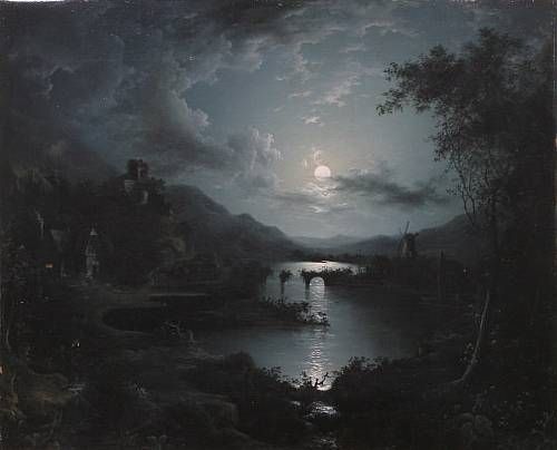 Moonlit river scene, windmill beyond