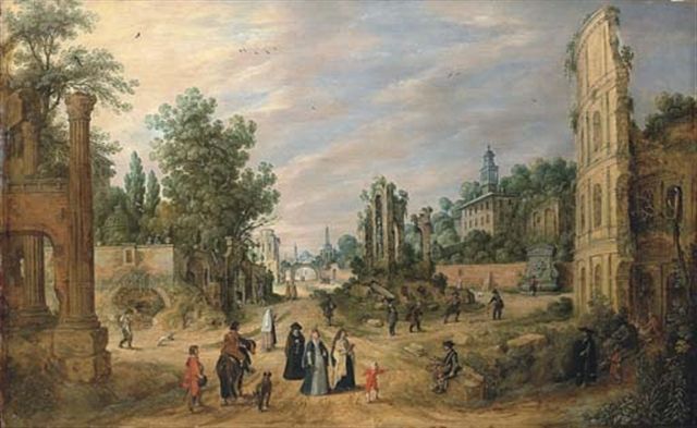 A capriccio of the Campo Vaccino, Rome, with elegant company and peasants