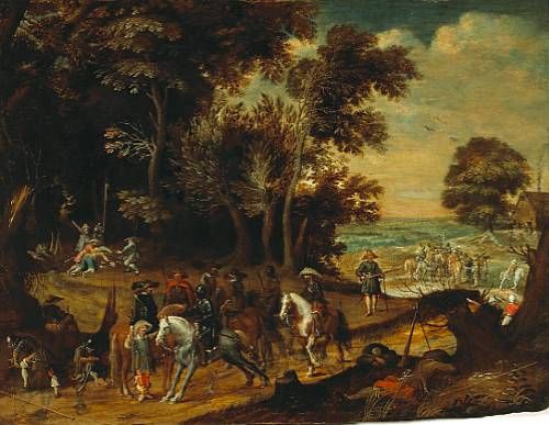Travellers and soldiers in an extensive wooded landscape