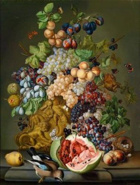 Large, Decorative Still Life with Flowers, with Fruit and a Jay
