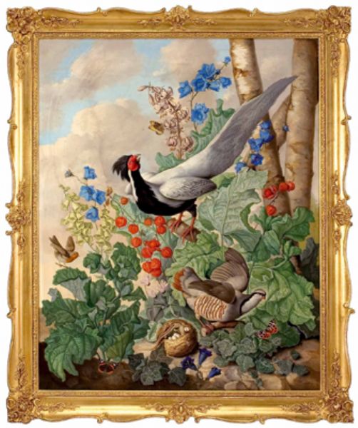 Stillleben mit Fasan und Henne, Alpen- und Wiesenblumen