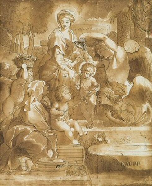 | In Parklandschaft Maria mit Jesuskind und Hl. Anna mit Johannes dem Täufer als Kind, von einen Blütenkorb tragenden Putti und En | |