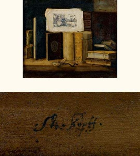 Vanité avec des livres, une gravure et une montre posés sur une table