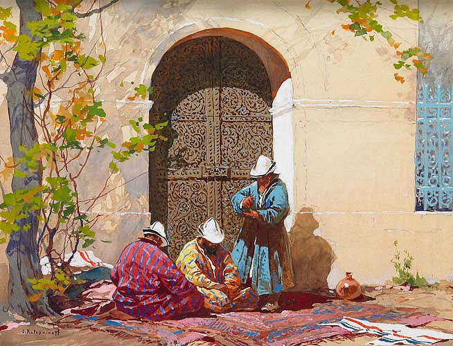 | Orientalische Händler vor Haustor. | |
