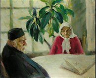 DAS AKADEMIEMITGLIED ZELINSKY UND DIE GROSSMUTTER HINTER DEM TISCH