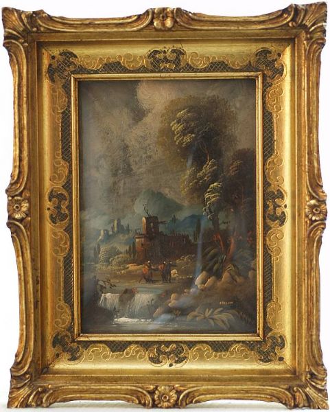 Pferde am Wasserfall vor Burg in weiter Landschaft