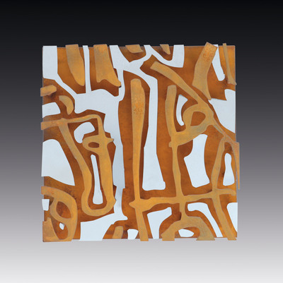 scultura in corten + acciaio inox a specchio 30x30x6 cm, firma e anno al retro, dichiarazione d'autenticità dell'artista su foto. | |