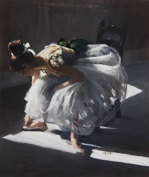 A ballerina adjusting her shoes