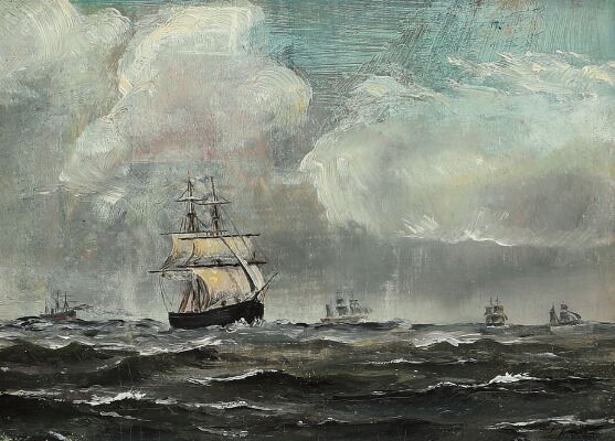 Ships at sea under some rainy clouds