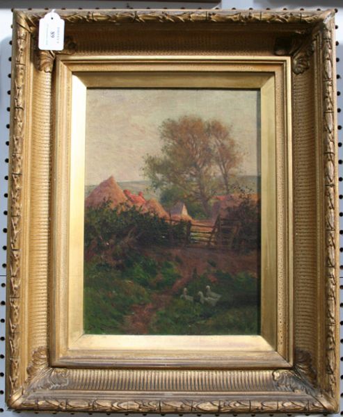View of Haystacks across a Bar Gate, Ducks in the foreground