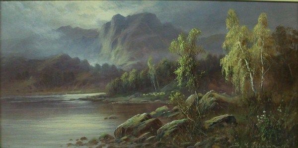 | a highland scene with a lake, rocky shore and trees to the fore and mountains to the background | |
