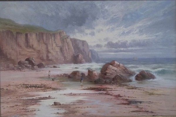 | a rocky Cornish shoreline with figures and a dramatically lit sky | |