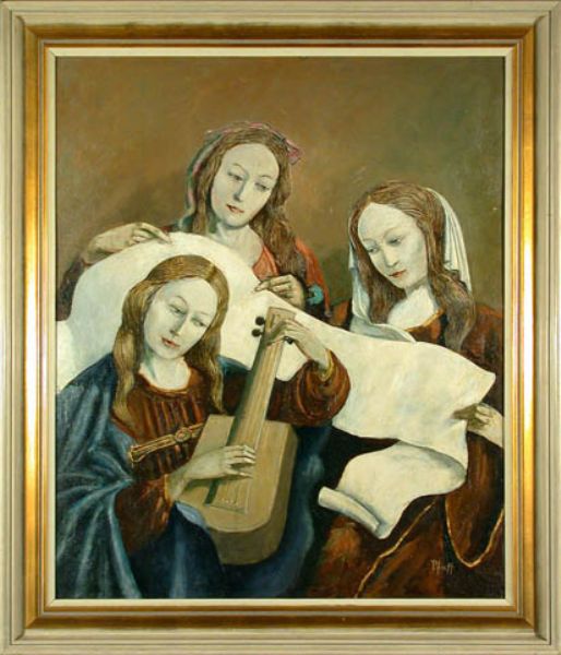| Gruppe von drei musizierenden Engeln, einer mit Saiteninstrument, zwei mit gerolltem Notenband | |
