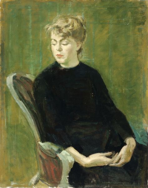 Portret van een meisje in zwarte japon tegen een groene achtergrond