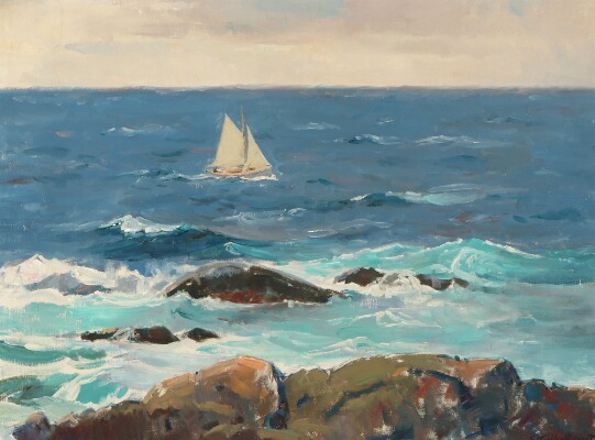 Sailing ship by a rocky coast