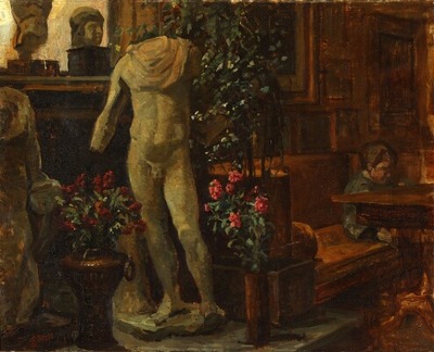 | Interior with a child reading in a room filled with antique sculptures and paintings | |