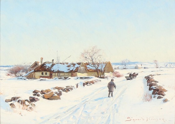 A snowcovered landscape with a sleigh and a wanderer on a road