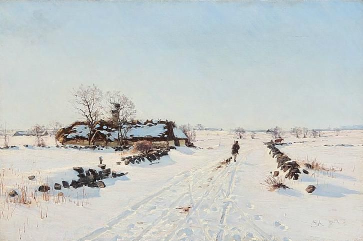 Snowy landscape with a hunter and his dog.