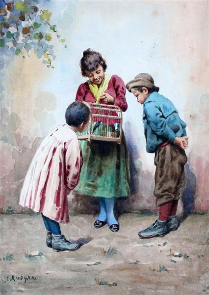 Woman and children with a birdcage