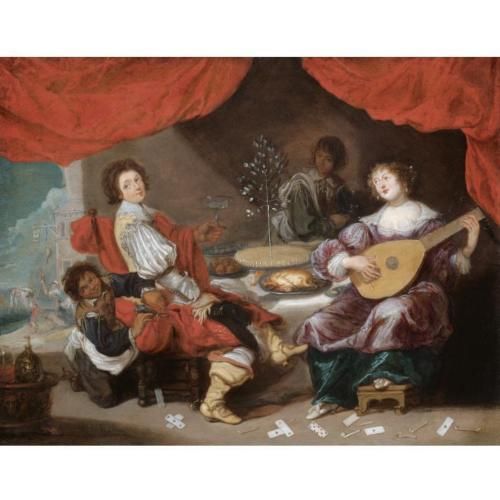 | AN INTERIOR WITH A LADY AND GENTLEMAN MAKING MUSIC AND FEASTING | |