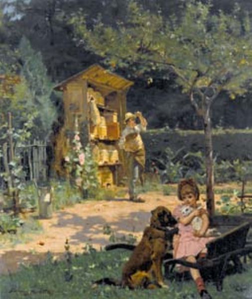 GARTEN MIT IMKER UND SPIELENDEM MÄDCHEN.