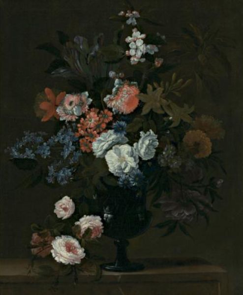 STILL LIFE OF FLOWERS IN A VASE RESTING ON A STONE LEDGE