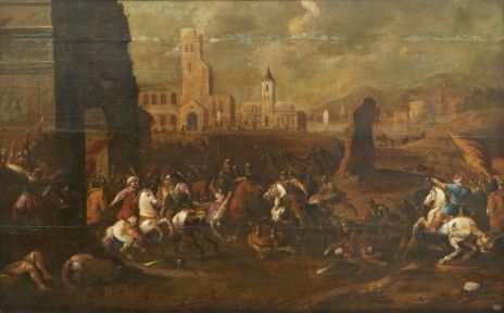 | Kavalleribatalj mellan turkar och kristna vid en triumfbåge | |