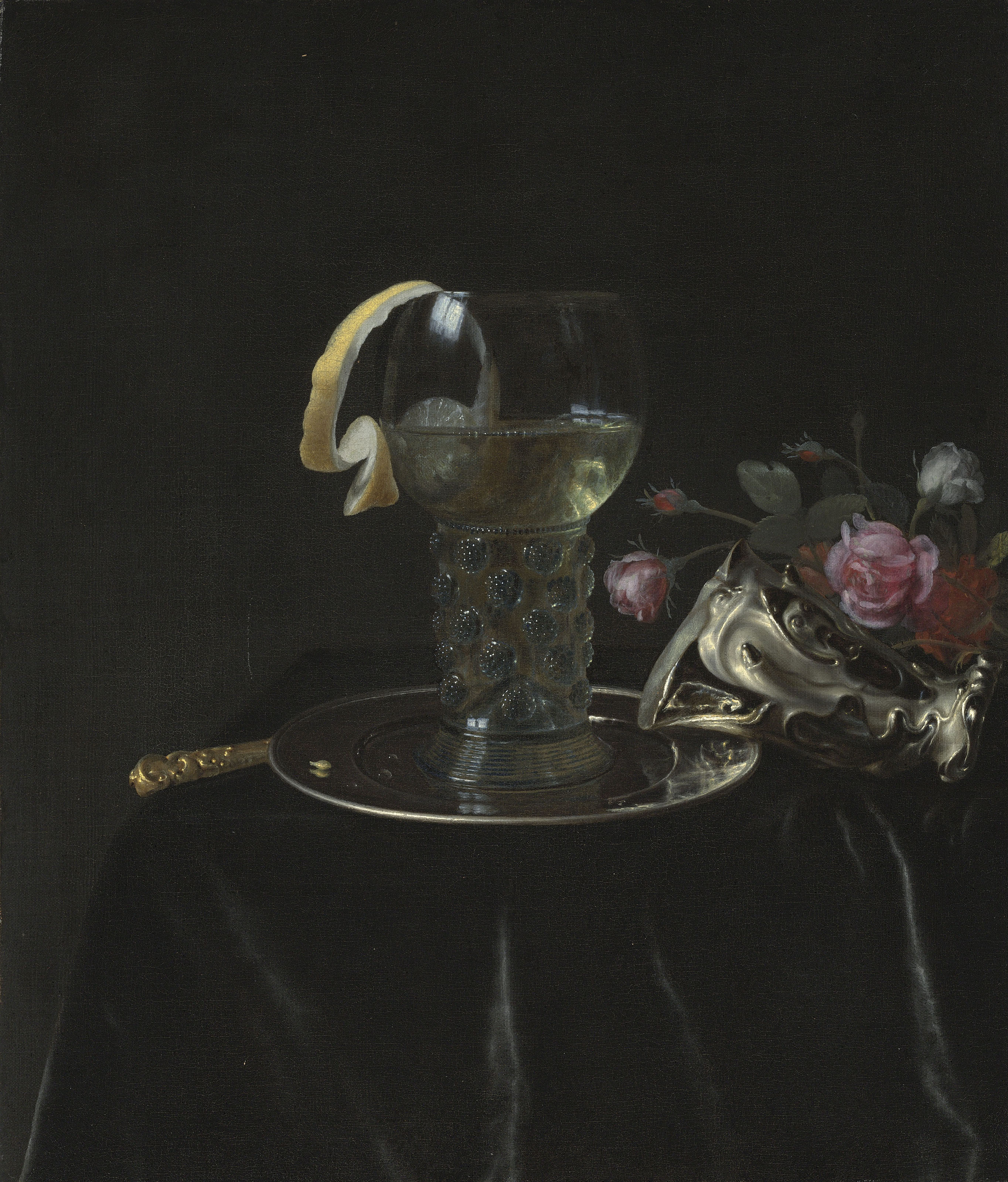 | A roemer of sweet wine on a pewter plate, with flowers and an auricular silver vase, on a draped table | |