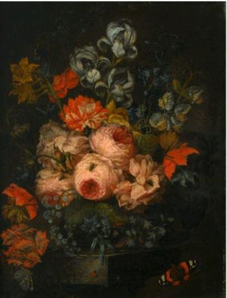 | ROSES, CHRYSANTHEMUMS, BLUEBELLS AND OTHER FLOWERS IN A GLASS VASE UPON A STONE LEDGE WITH HOVERING BUTTERFLY, HOUSEFLIES AND LA | |
